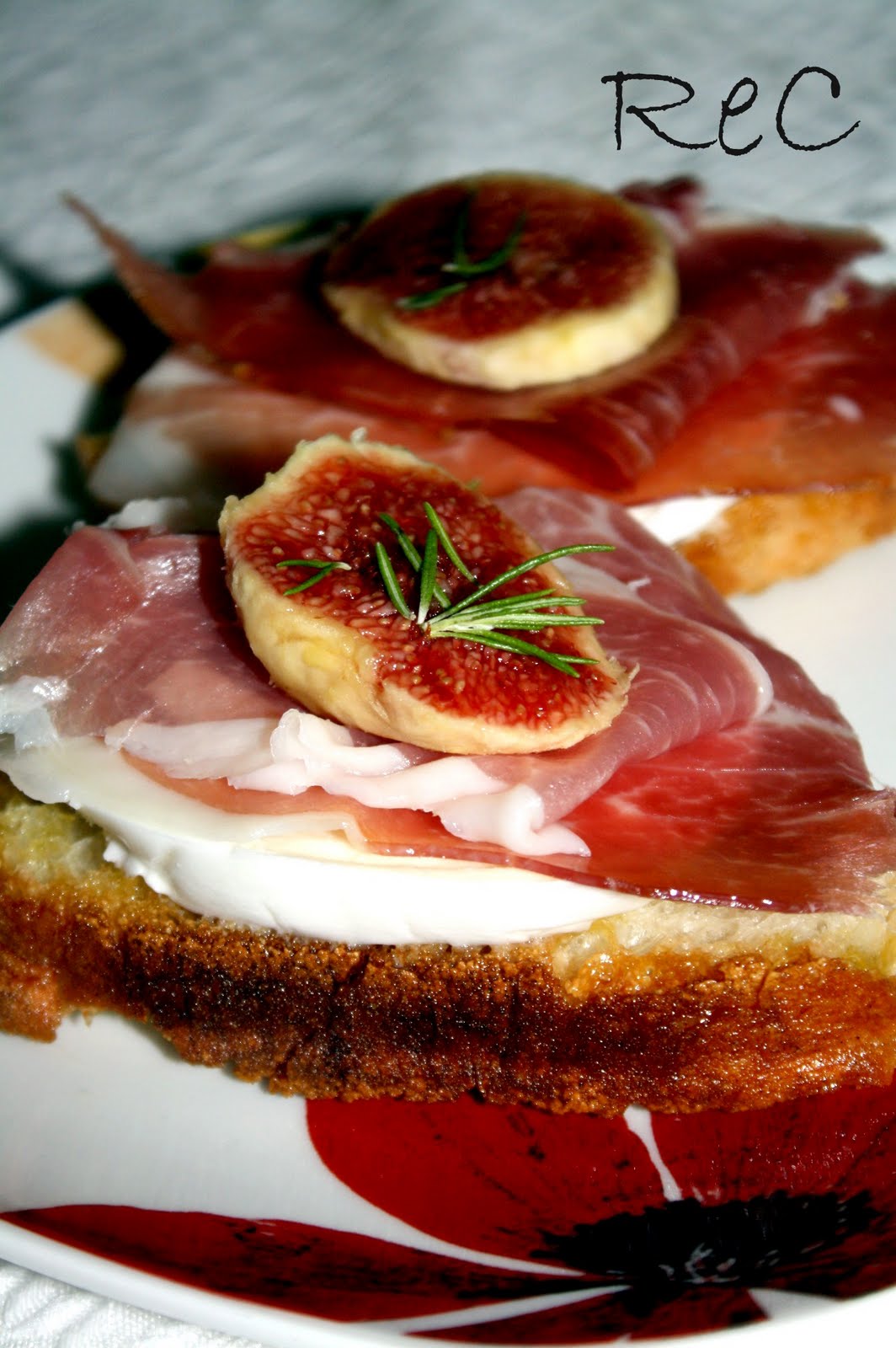 Bruschette al rosmarino con mozzarella di bufala, prosciutto e fichi