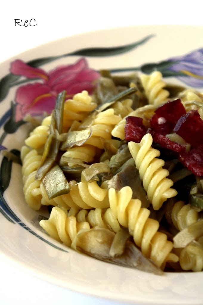 Pulire i carciofi privandoli delle parti esterne e immergerli in acqua e limone, tagliarli in due e poi a fettine sottili sottili; scaldare l’olio con l’aglio, senza farlo soffriggere troppo, aggiungere i carciofi e unire circa un bicchiere di acqua calda (o brodo), salare e continuare ad aggiungere acqua o brodo ogni qualvolta i carciofi risultassero troppo asciutti; cuocerli per circa 20-30 minuti,o comunque fino a quando risulteranno morbidi. Tagliare il salame a fette sottili e poi a quadrettini; nel frattempo cuocere la pasta in acqua bollente salata, una volta pronta saltarla in padella con i carciofi e un pò d’acqua di cottura, impiattare e completare con il salame saltato pochissimi secondi in padella.