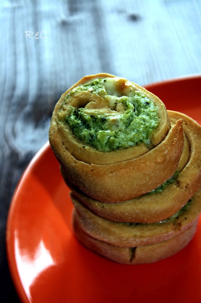Quando l’impasto è pronto, stenderlo con il mattarello e cercare di ottenere un rettangolo, cospargere la crema di broccoli sull’impasto, arrotolare l’impasto sul lato lungo e tagliare l’impasto allo spessore di circa 1,5 cm; io ho ottenuto circa 24 spirali; far cuocere in forno a 220°C per una mezz’oretta o fin quando sono coloriti.