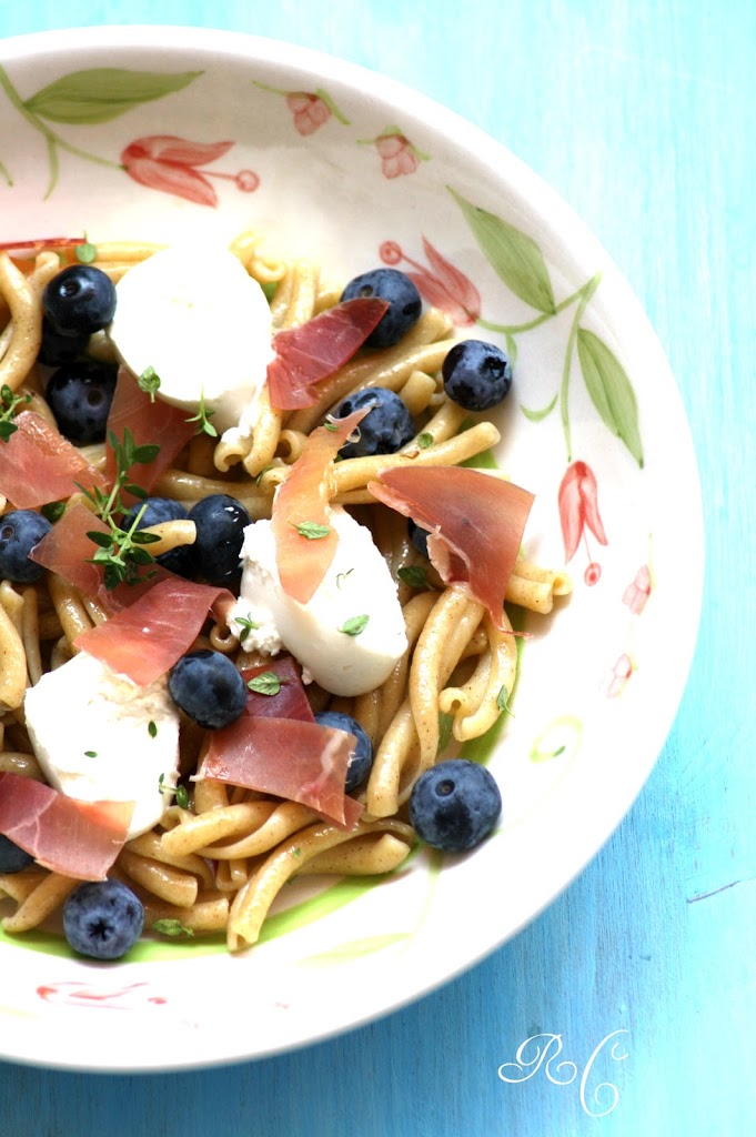 Per questo oggi vi offro un’insalata di pasta estiva, con poco prosciutto, quel che basta per donare un pò di sapidità, il caprino e i mirtilli freschi che danno freschezza e colore.