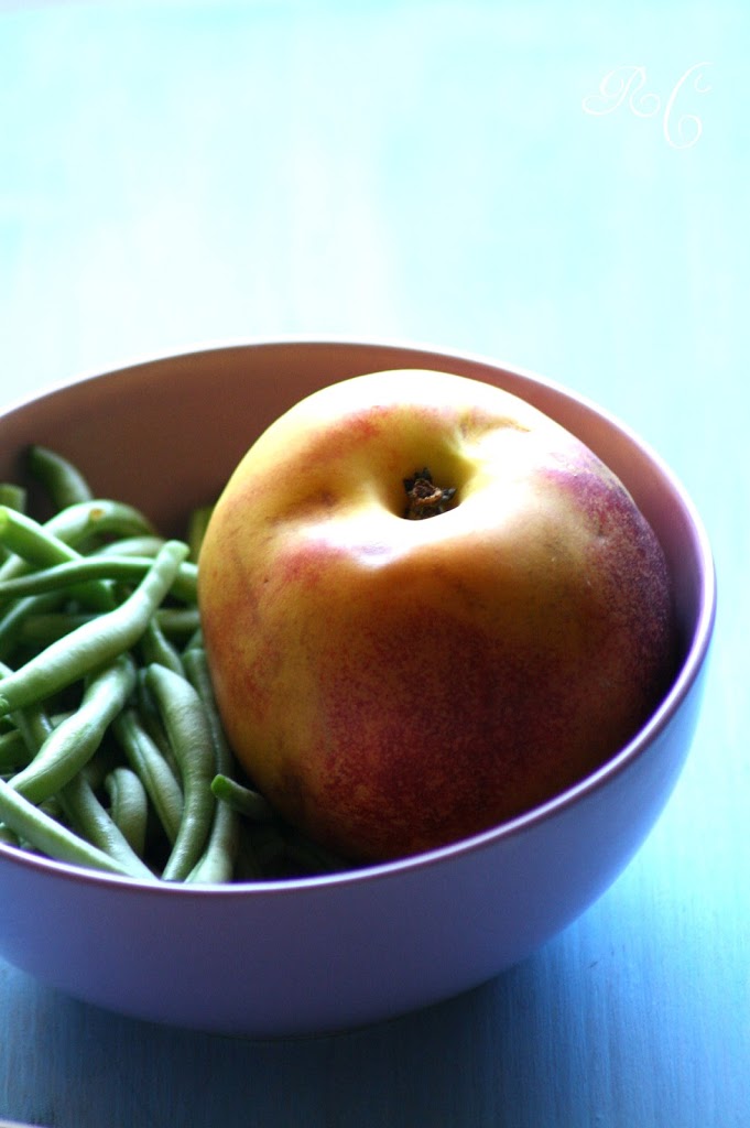 Che riso originale! Poi c’e anche la pesca e quindi.. approvo in pieno!! 😀 Sei stata bravissima, hai dato il giusto valore a questi fagiolini tanto attesi! Complimenti e buon lunedì! 🙂