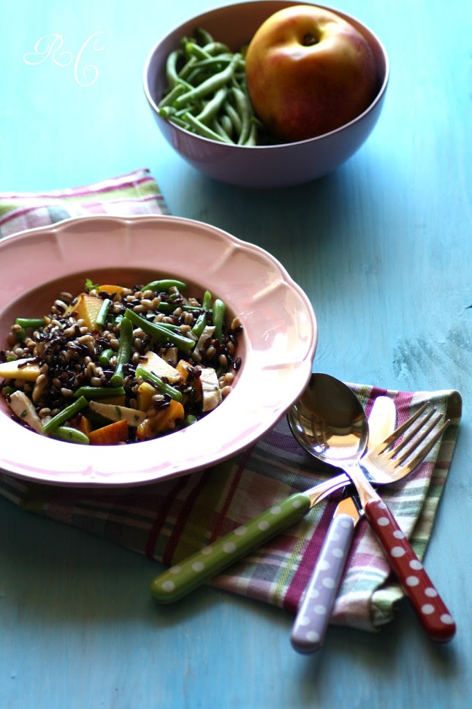 Finalmente i fagiolini dell’orto son arrivati sulla tavola! Non chiedetemi perchè, ma i miei ormai erano quasi dell’idea di toglier tutto.. erano mesi che c’erano fiori ma non i loro frutti, ma finalmente son arrivati e io li ho immediatamente utilizzati per un’insalta freschissima.. in realtà avevo già proposto qualcosa di simile qui, ho aggiunto solo olive taggiasche, tanto basilico e splendidi cereali, in particolare il riso venere,che in cottura sprigiona quel profumo inebriante che conquista tutti..e il farro, che nella mia cucina non manca mai!