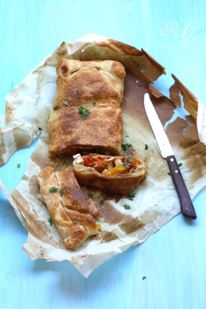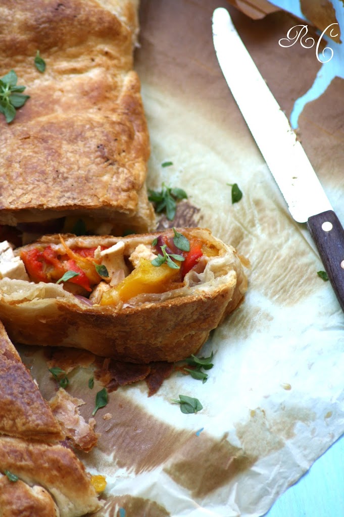 Rotolo sfogliato con pollo, peperoni e cipolla rossa