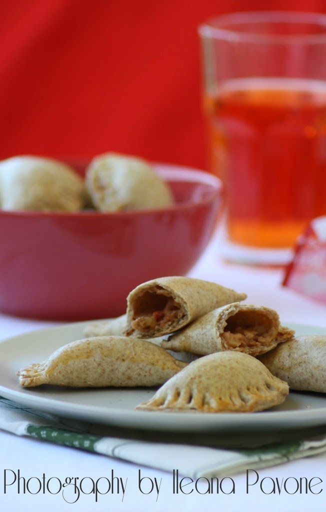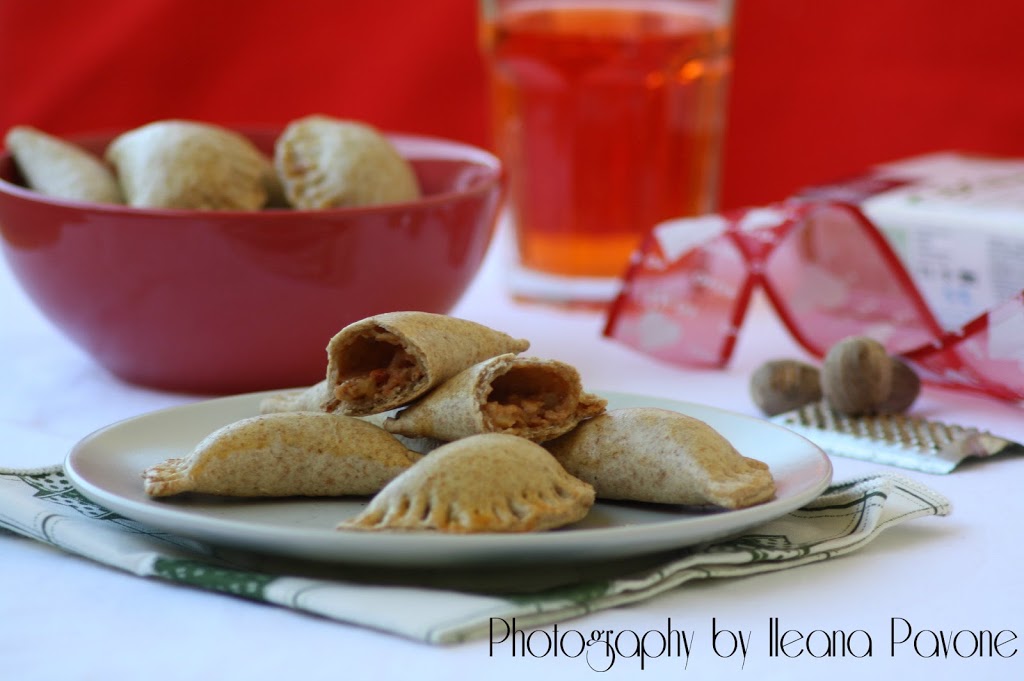 Mescolare le farine con il burro freddo tagliato a pezzetti, unire le spezie ed il sale e ottenere un impasto sabbioso con la punta delle dita; aggiungere acqua fredda quanto basta per ottenere un impasto omogeneo. Stendere l’impasto e ritagliare dei dischetti. Farcire con il composto di patata schiacciata, ragù di soia, parmigiano e noce moscata, chiudere a mezaluna e sigillare bene con una forchetta. Spennellare con l’uovo con l’aiuto di un pennello e cuocere in forno a 180°C per circa 20 minuti.