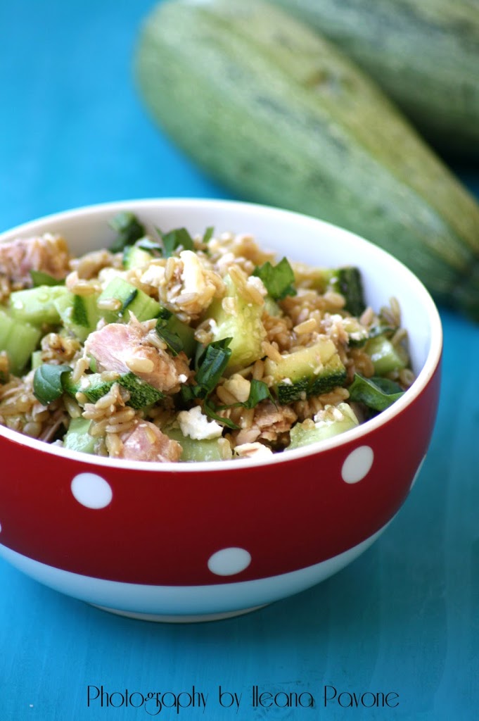 Mescolare l’avena alle zucchine, aggiungendo il tonno scolato, la feta sbriciolata con le mani e il cetriolo tagliato a pezzetti. Condire con olio e abbondante basilico fresco. Io non ho aggiunto sale oltre a quello di cottura dell’avena, con il tonno e la feta l’insalata risulta ben saporita senza ulteriore aggiunta di sale.