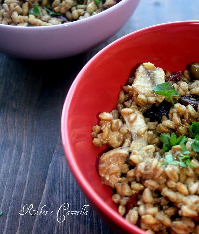 Insalata di farro con pesce spada, alici, olive e pomodori secchi