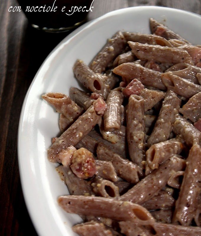 Penne al farro integrale con pesto di nocciole e speck